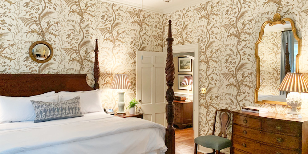 Connor explains that the lifestyle of our community of owners helped provide cues. “In one room, I incorporated turtle shells into the décor.” While that may be an unexpected touch in a strictly traditional Georgian house, our community’s emphasis on the outdoors and the remarkable natural beauty that surrounds and sustains the Inn makes the presence of something like a turtle shell seems entirely fitting. The stage for such elements is set immediately with a dramatic wallpaper mural depicting a sporting scene. Connor brought in a muralist from Charleston to restore the mural. Tasteful taxidermy and sporting art scattered throughout add layers of décor traditionally associated with a Southern country house.