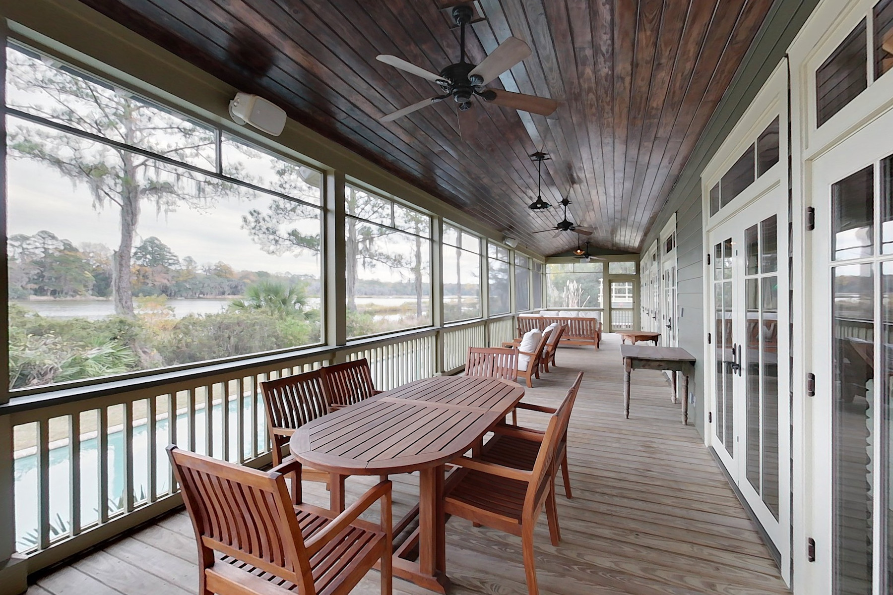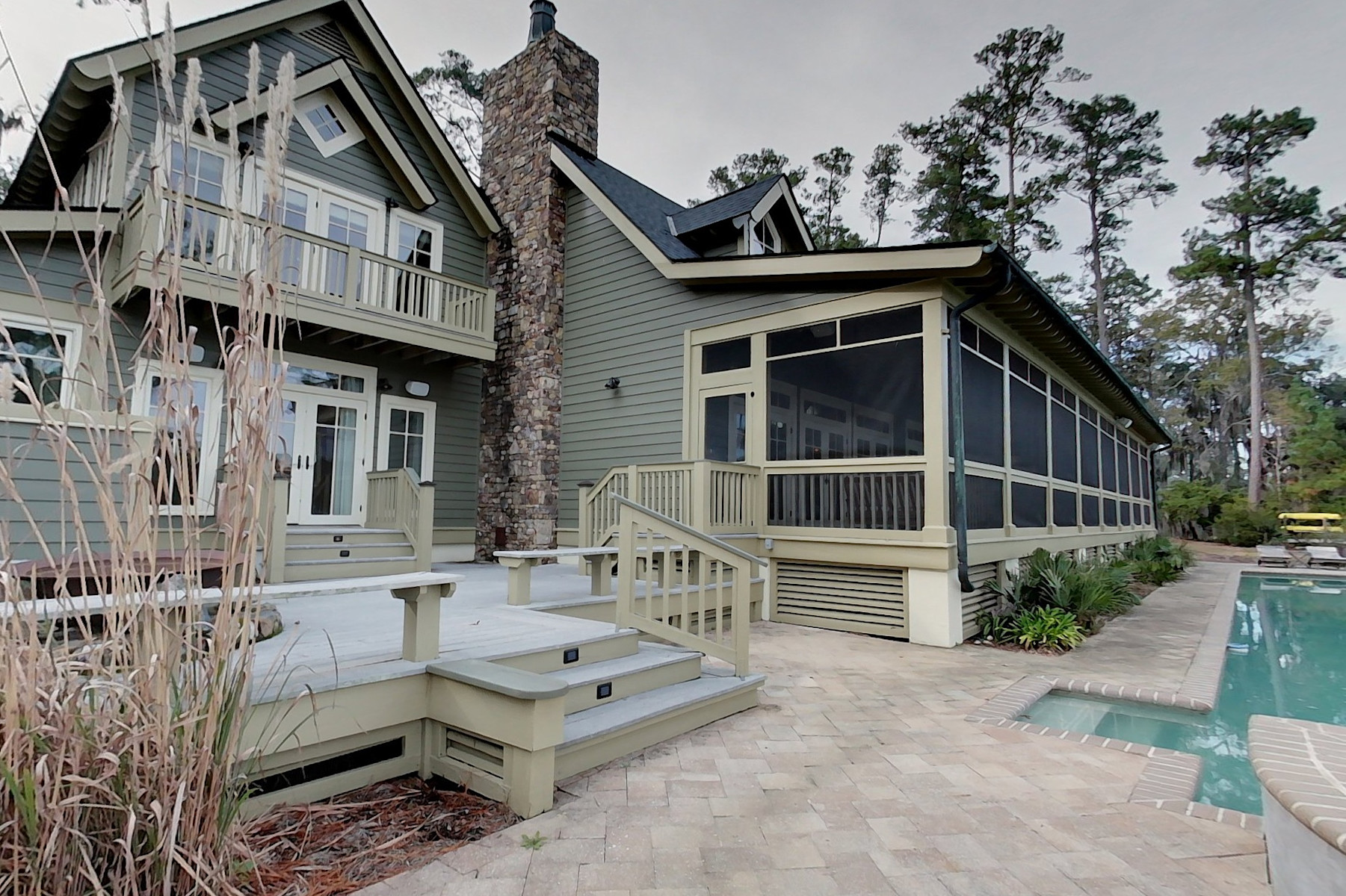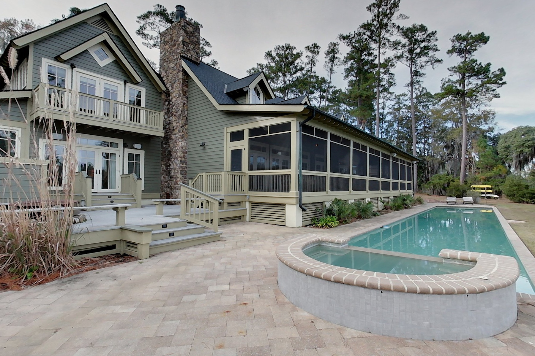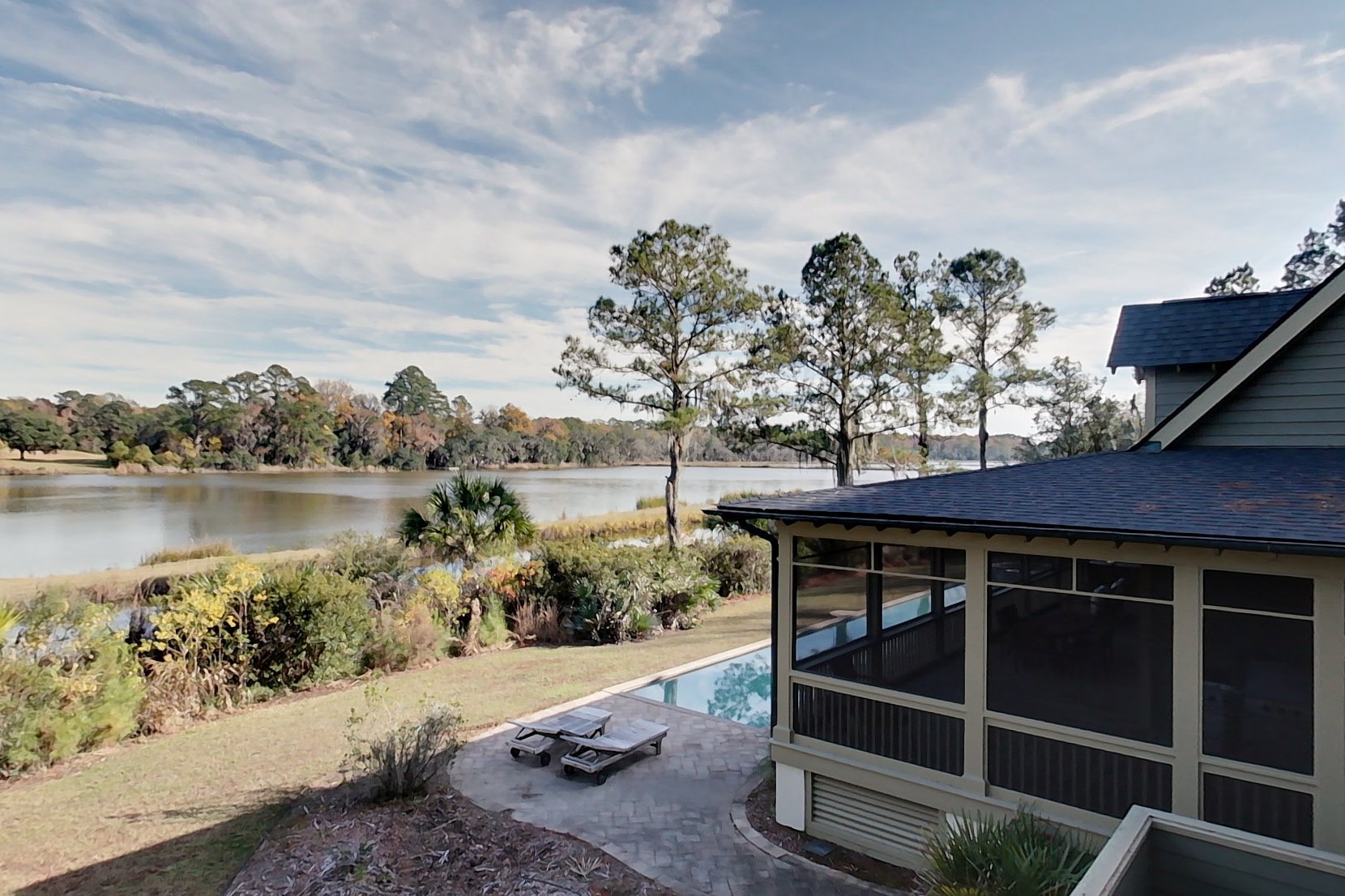 Located on a salt pond close to the Inn, pools, fitness center, tennis and equestrian facilities, this home gives you the ability to fish, crab and shrimp right in your own backyard. This beautiful home has five bedrooms, a pool, oversized garage and a guest house for family and friends. The main house features raised ceilings in the living area and a master suite with private screened porch. The kitchen overlooks the pool and hot tub with the salt pond beyond and contains intimate sitting / dining area and office. There are two bedrooms and a bath upstairs. Over the garage is a private two bedroom, two bath guest house with balcony overlooking the pond. This is a well-constructed home in a prime Brays Island location.