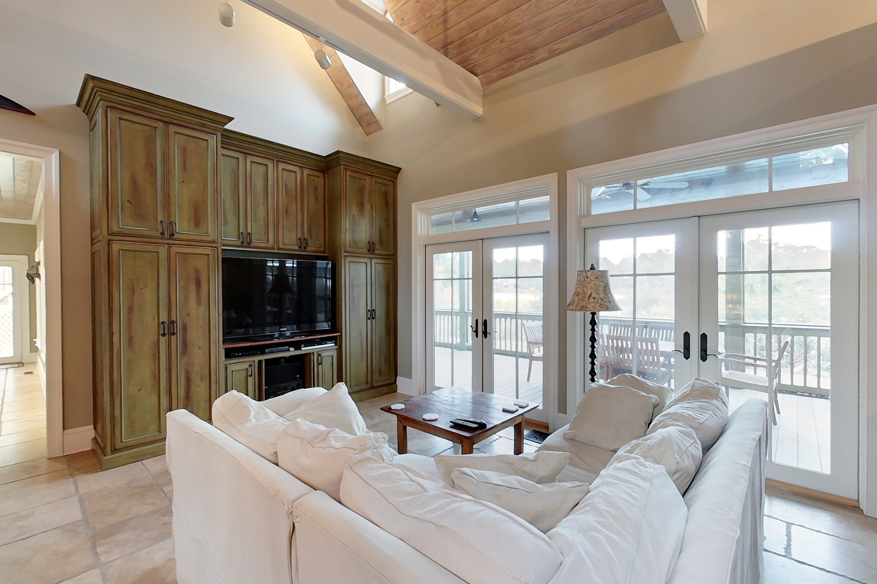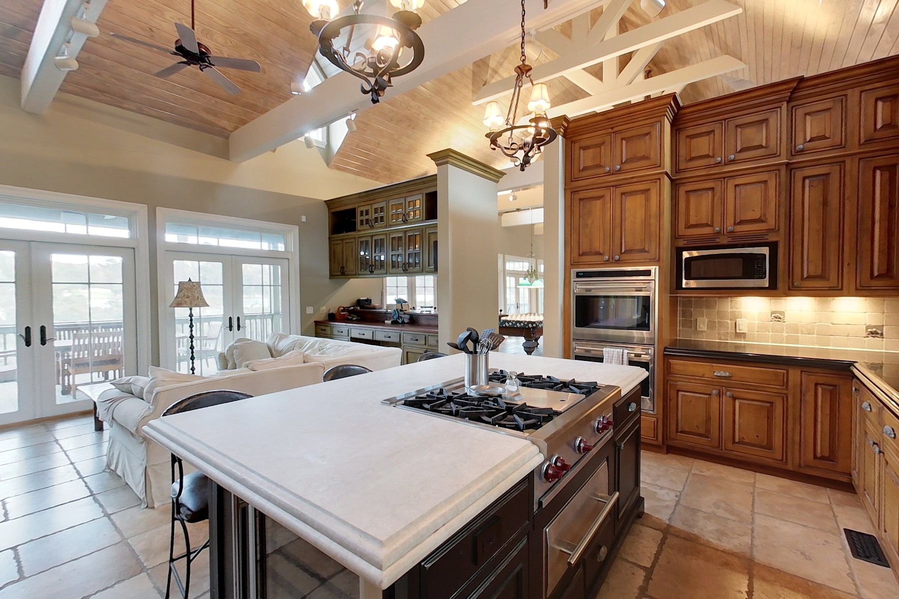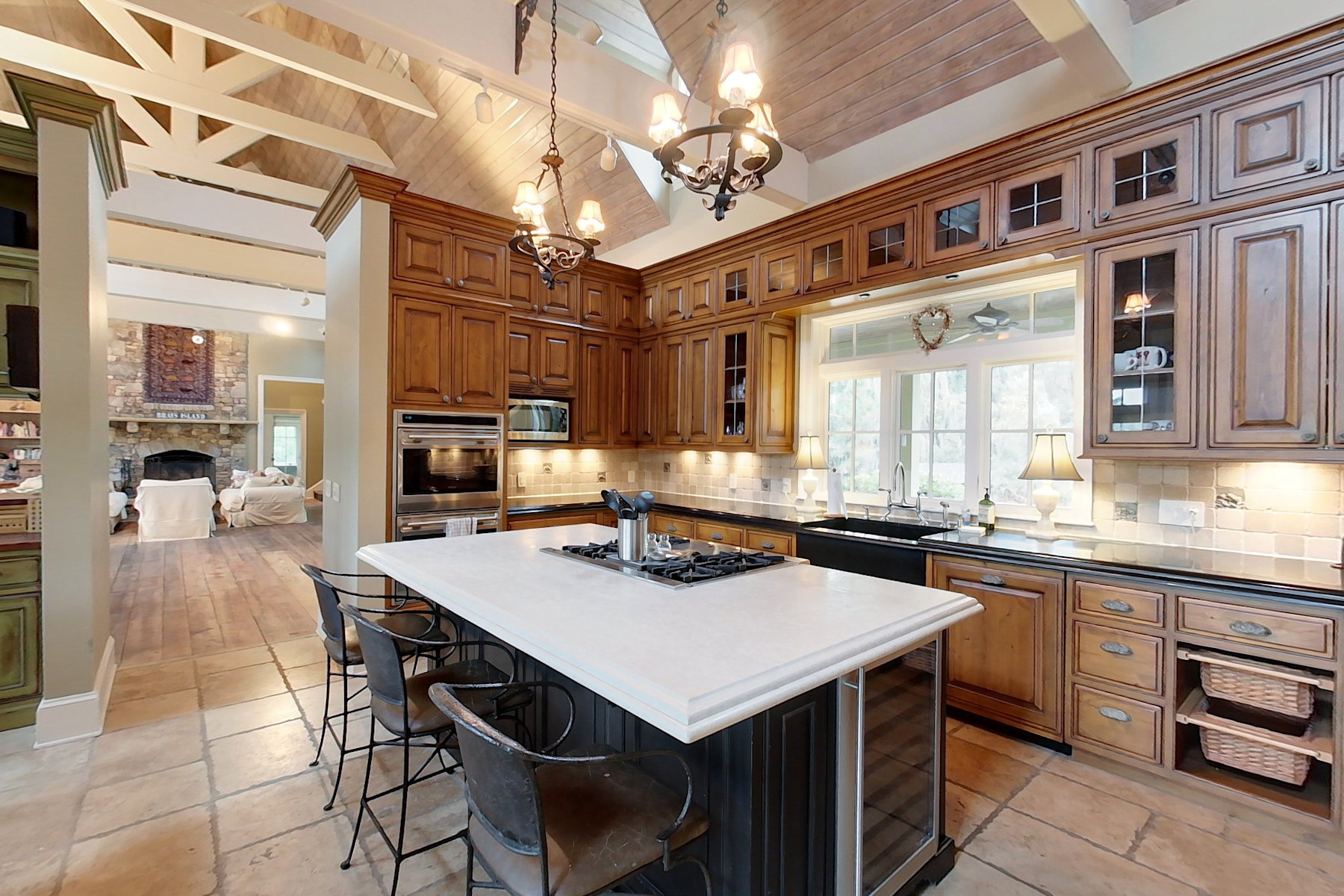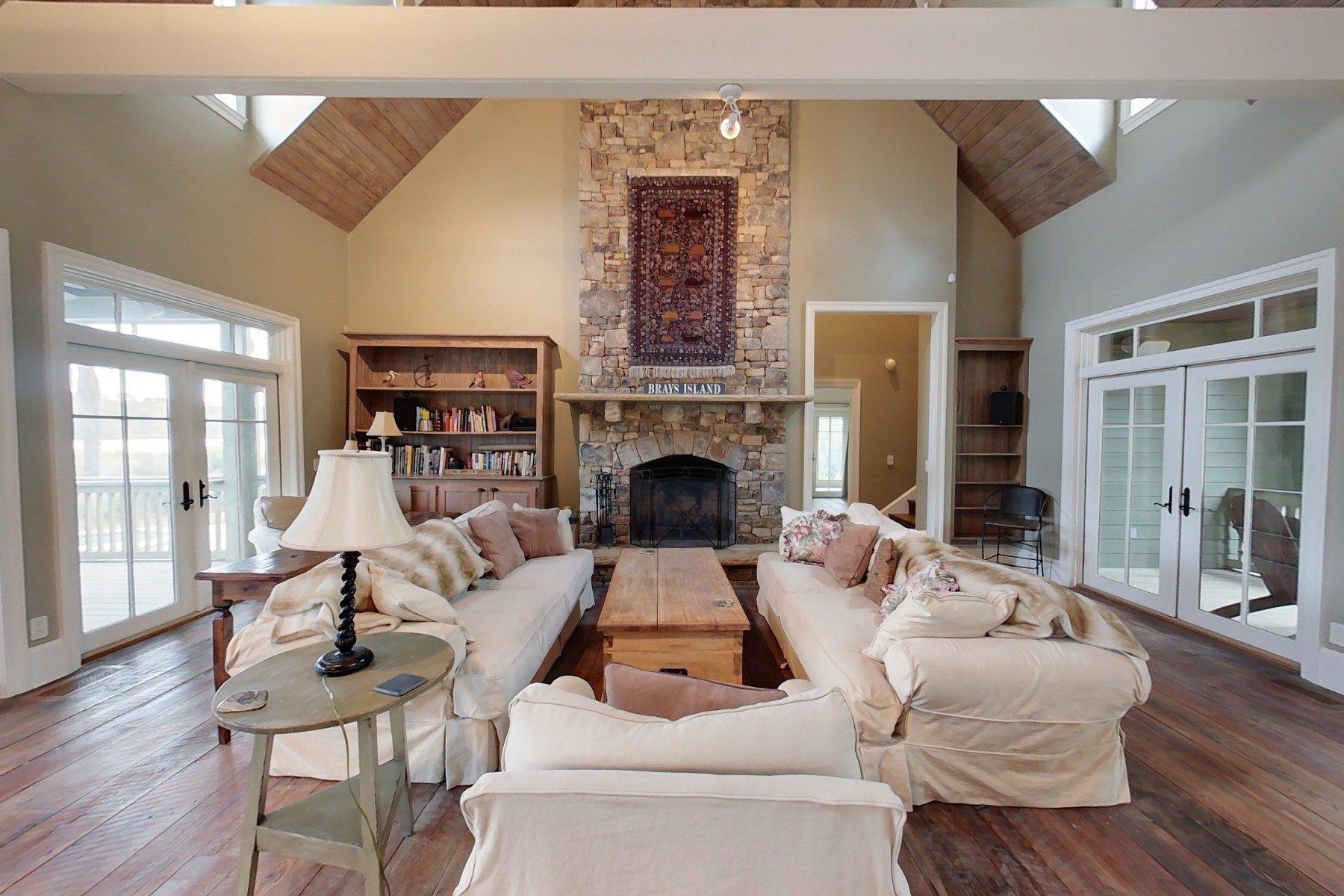 Located on a salt pond close to the Inn, pools, fitness center, tennis and equestrian facilities, this home gives you the ability to fish, crab and shrimp right in your own backyard. This beautiful home has five bedrooms, a pool, oversized garage and a guest house for family and friends. The main house features raised ceilings in the living area and a master suite with private screened porch. The kitchen overlooks the pool and hot tub with the salt pond beyond and contains intimate sitting / dining area and office. There are two bedrooms and a bath upstairs. Over the garage is a private two bedroom, two bath guest house with balcony overlooking the pond. This is a well-constructed home in a prime Brays Island location.