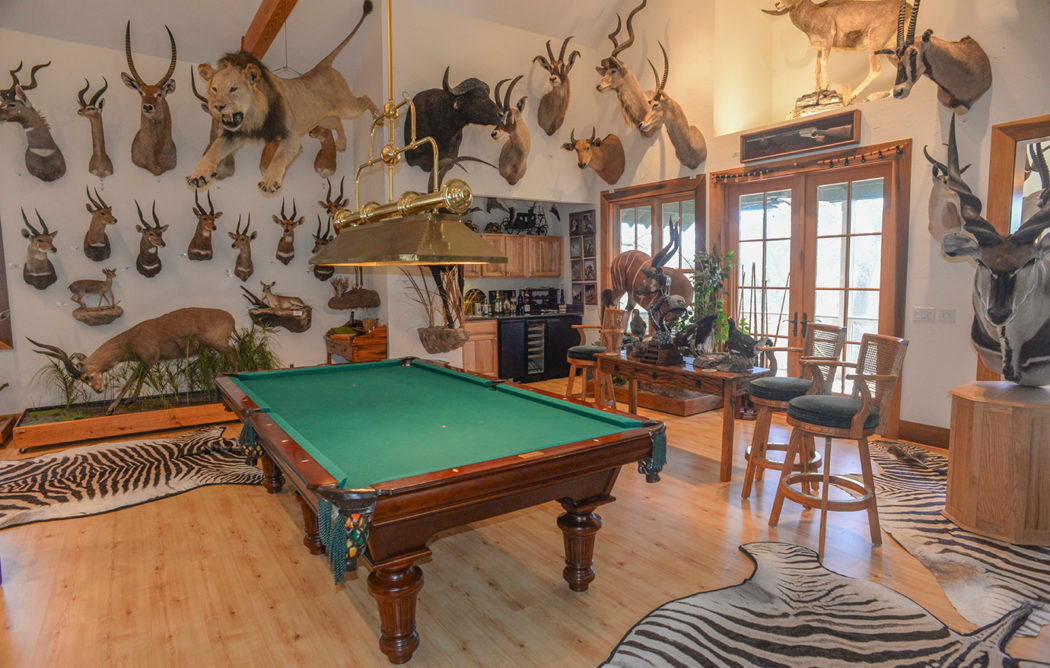 The three bedroom main house has a lower level master bedroom, fireplace, generous kitchen area with a formal dining room and a 2 car garage. There is an additional bedroom upstairs with a lovely office / entertaining area. The guest house has a 2 car garage, 2 bedrooms, each with a bathroom and full kitchen which affords guests utmost privacy. Above the guest house and garage is a fabulous trophy room which is second to none in terms of giving the outdoorsman an opportunity to display their trophies. This structure could certainly be repurposed as a game room, art studio or other. Additional features include a welcoming porte-cochere as one enters the property, hardwood flooring, a fabulous mahogany front door and coffered ceiling in the living room. This beautiful home is a must see!