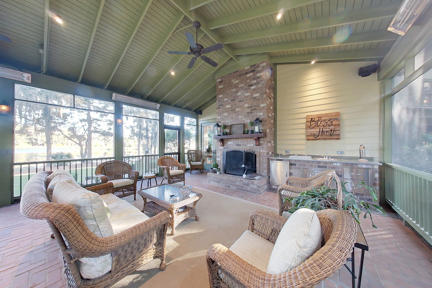 Enjoy sunrise and sunset views over Davis pond from this gorgeous home nestled amongst old Live Oak trees. This four bedroom, three and a half bathroom home has an open floor plan flowing out to an all season oversized screened porch with fireplace, bar and never ending view over the pond. Special features include heart of pine flooring, 30’ ceiling in the lounge, high end appliances, surround sound media room, a separate study, a work room adjoining the garage, a standby generator, central vac system and plenty of storage space throughout the home. A separate two bedroom guest house is perfect for extended family visits. This home is meticulously cared for and move-in ready!